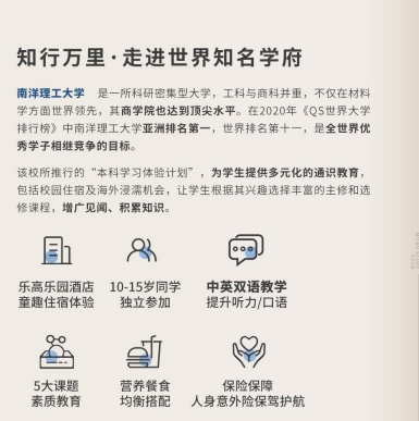 南洋理工大学STEM 课程-智机器人] (约 120 分钟前往全球百名排行内的南大参观。作为新加坡首屈一指的世界级顶尖大学,立足亚洲、放眼世界,是新加坡历史悠久、规模最大的国际一流大学,在亚洲大学排名中均位列前茅。徜徉在大学静谧氛围内,了解现代化的教学环境,体验高等学府的学习氛围及专业设施,了解新加坡最顶尖教育的历史发展,更有机会和留学生交流海外求学经历及经验。